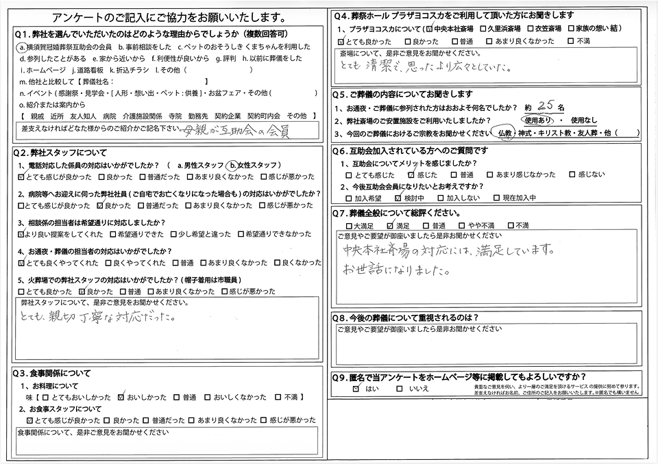西村葬儀社では、葬儀を終えられたご遺族の方にアンケートにご協力いただき、より良いサービスの提供に努めております。