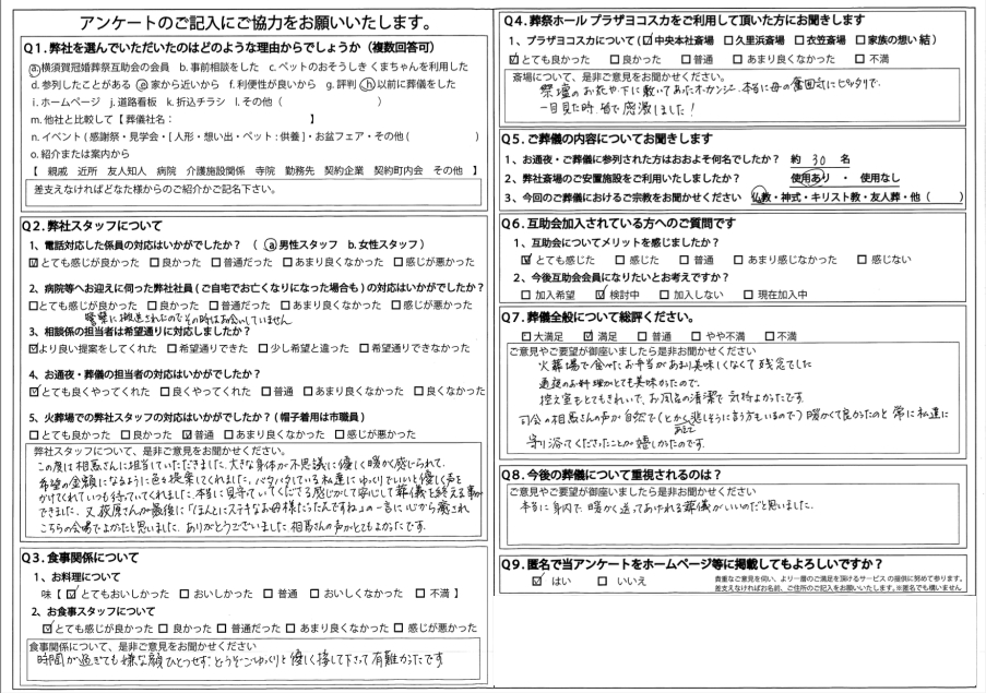西村葬儀社では、葬儀を終えられたご遺族の方にアンケートにご協力いただき、より良いサービスの提供に努めております。