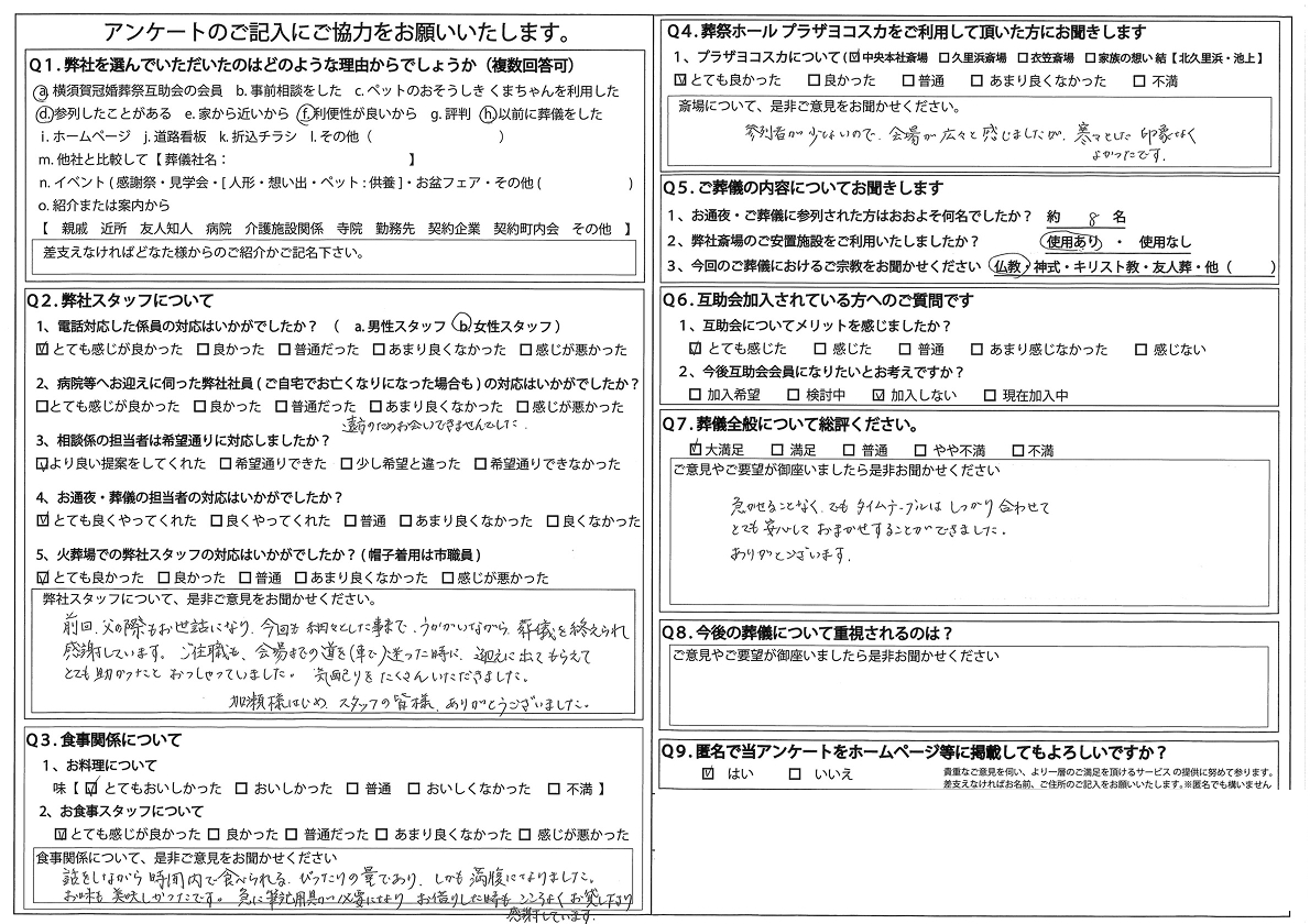 西村葬儀社では、葬儀を終えられたご遺族の方にアンケートにご協力いただき、より良いサービスの提供に努めております。