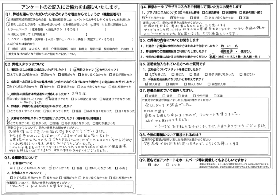 西村葬儀社では、葬儀を終えられたご遺族の方にアンケートにご協力いただき、より良いサービスの提供に努めております。
